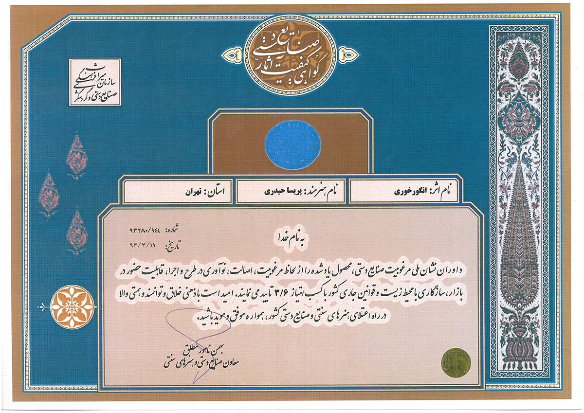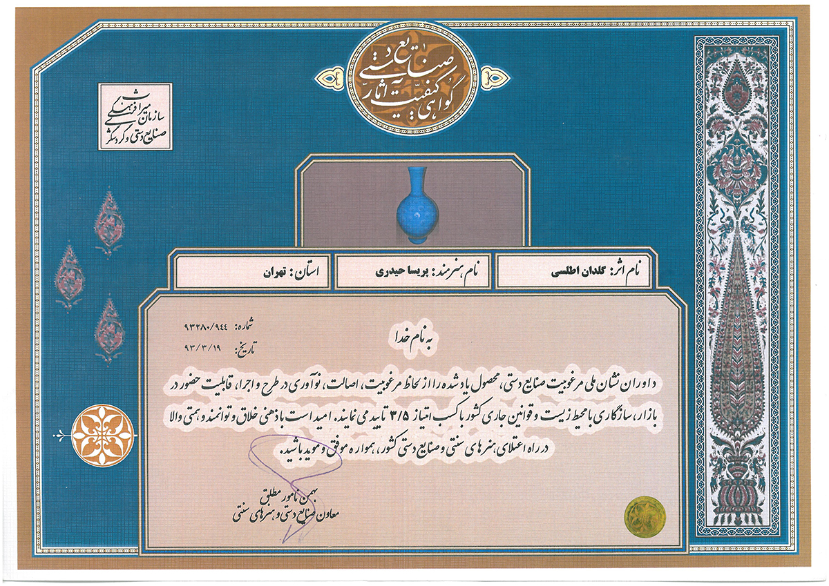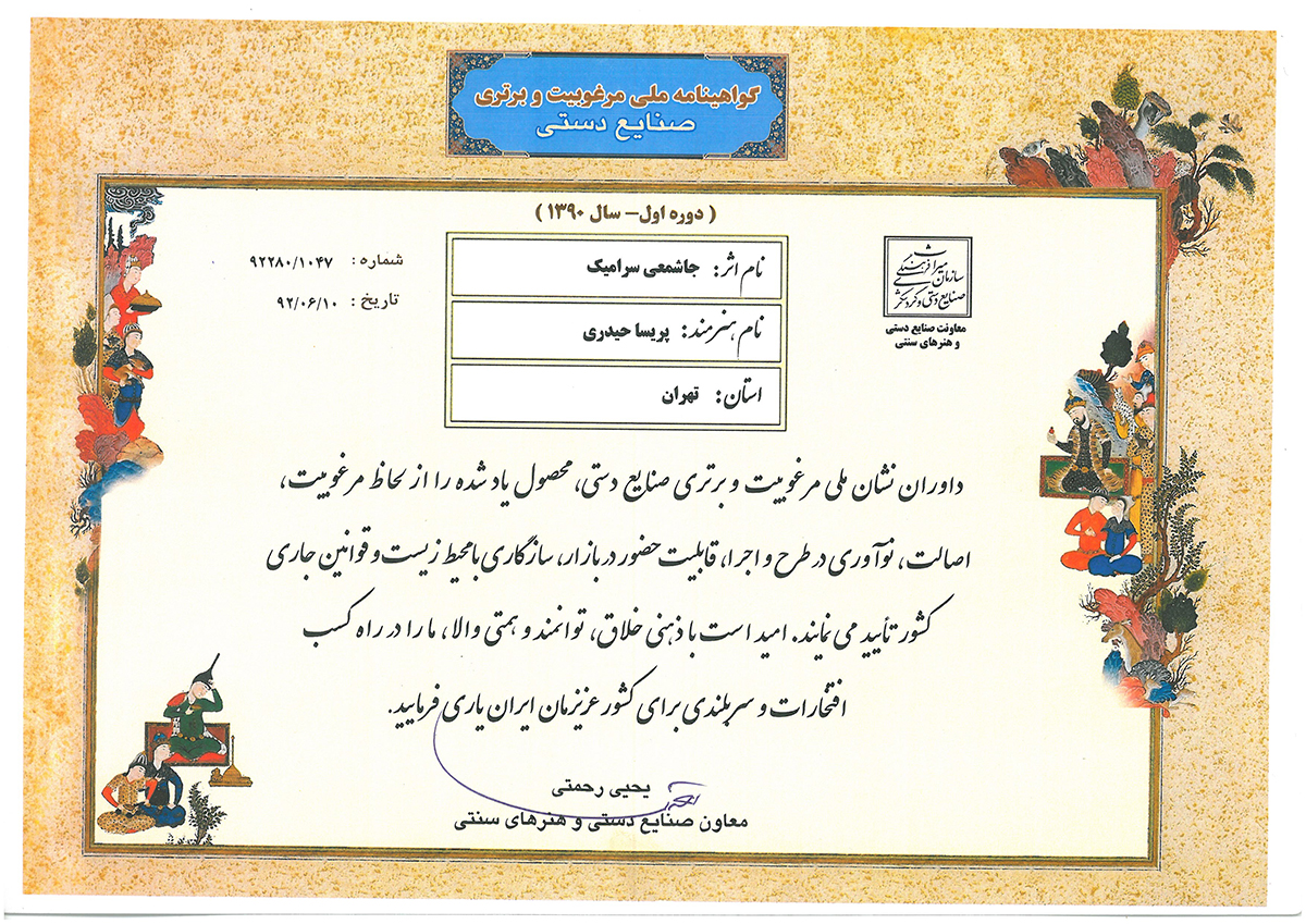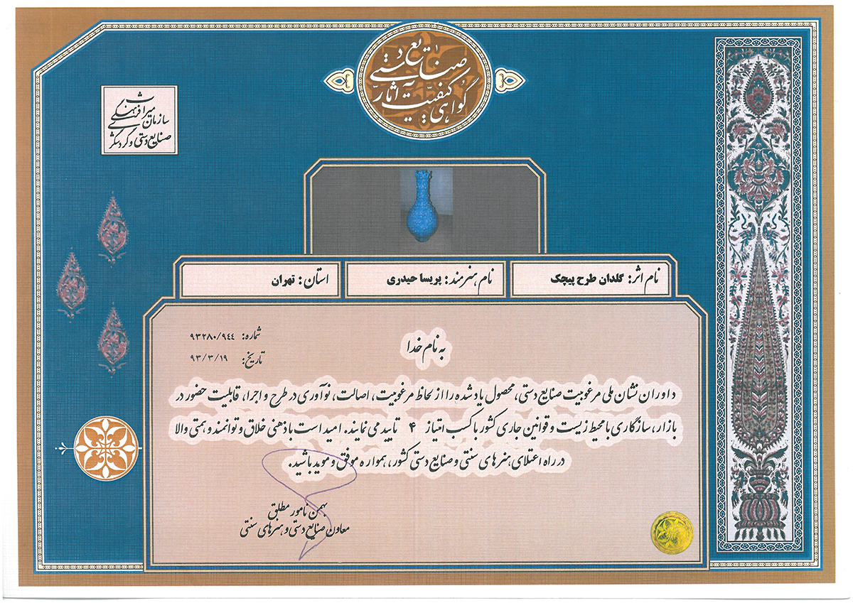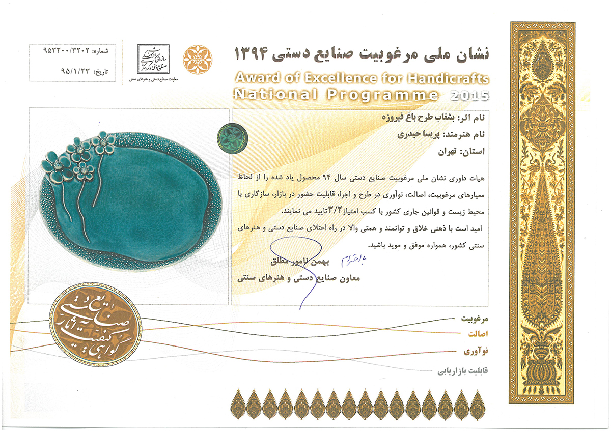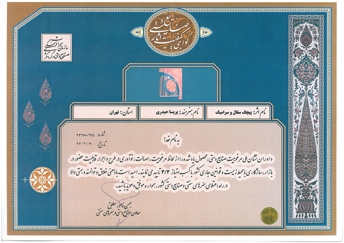 شرکت در چندین نمایشگاه بین المللی ملی صنایع دستی ایران از جمله در سالهای:1397-1395-1394-1392...1388